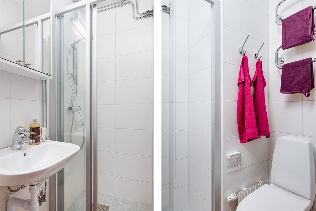 Helkaklat badrum med golvvärme , dusch , handdukstork och kommod.