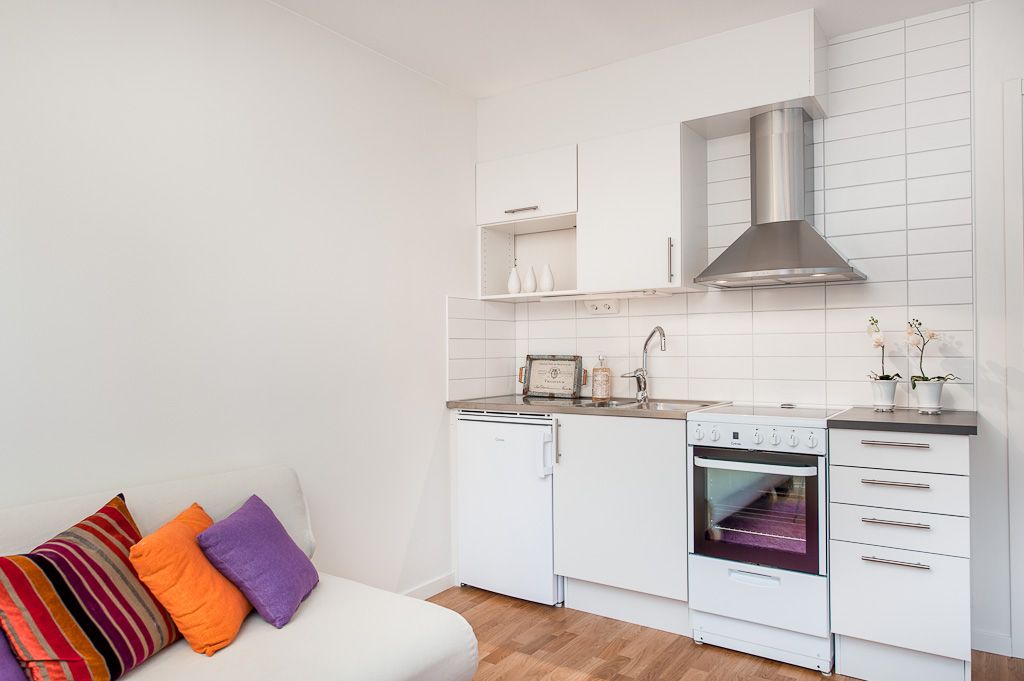 Köksdelen har vita skåpsluckor , glaskeramikspis med ugn och kyl med frysfack.