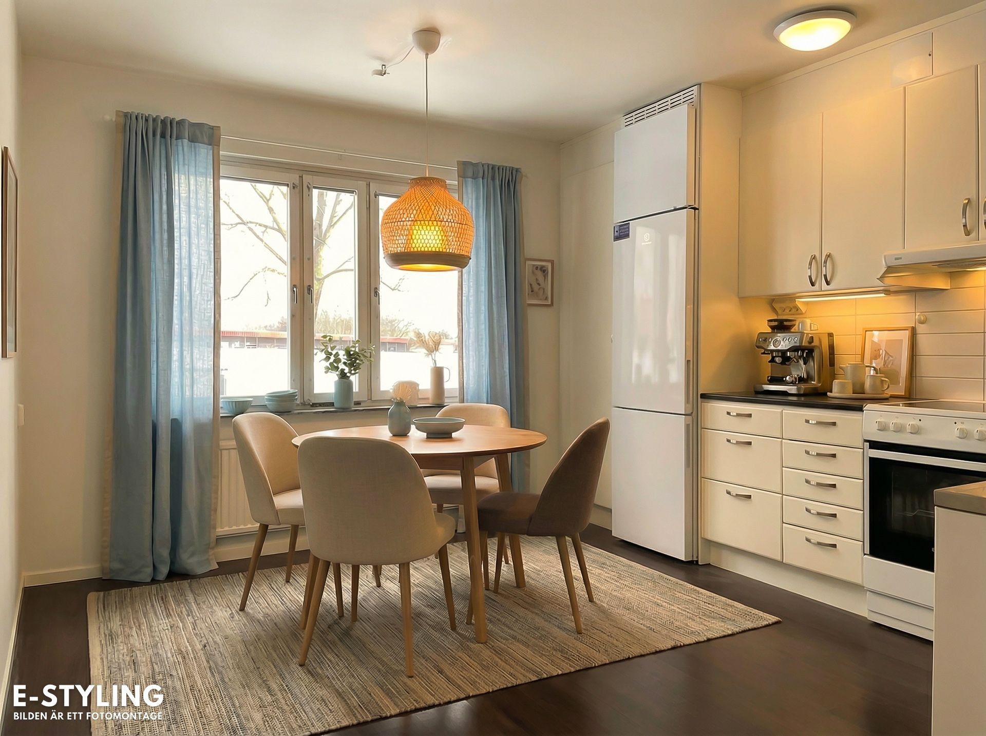 Köket är utrustat med spis med häll och ugn, spiskåpa och kyl/frys De vita köksluckorna och den mörkgrå bänkskivan skapar ett modernt och tidlöst intryck, och här finns gott om plats för dig som gillar att laga mat.