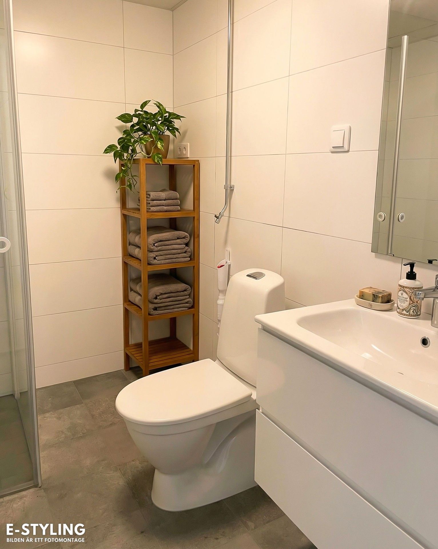 Här får du ett nyrenoverat badrum med vitt kakel, grått klinker, duschdörrar, wc och tvättställ med kommod - ett stilrent och fräscht utrymme som ger en lyxig känsla.