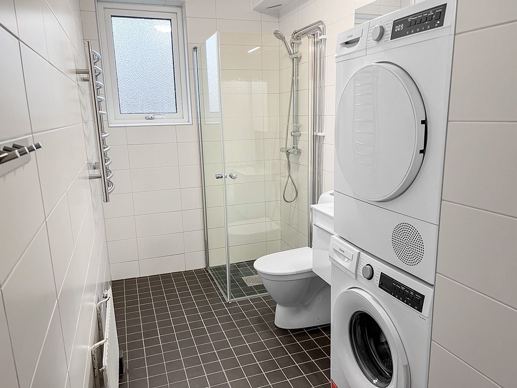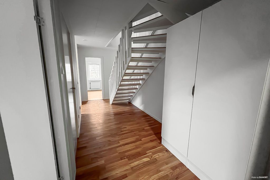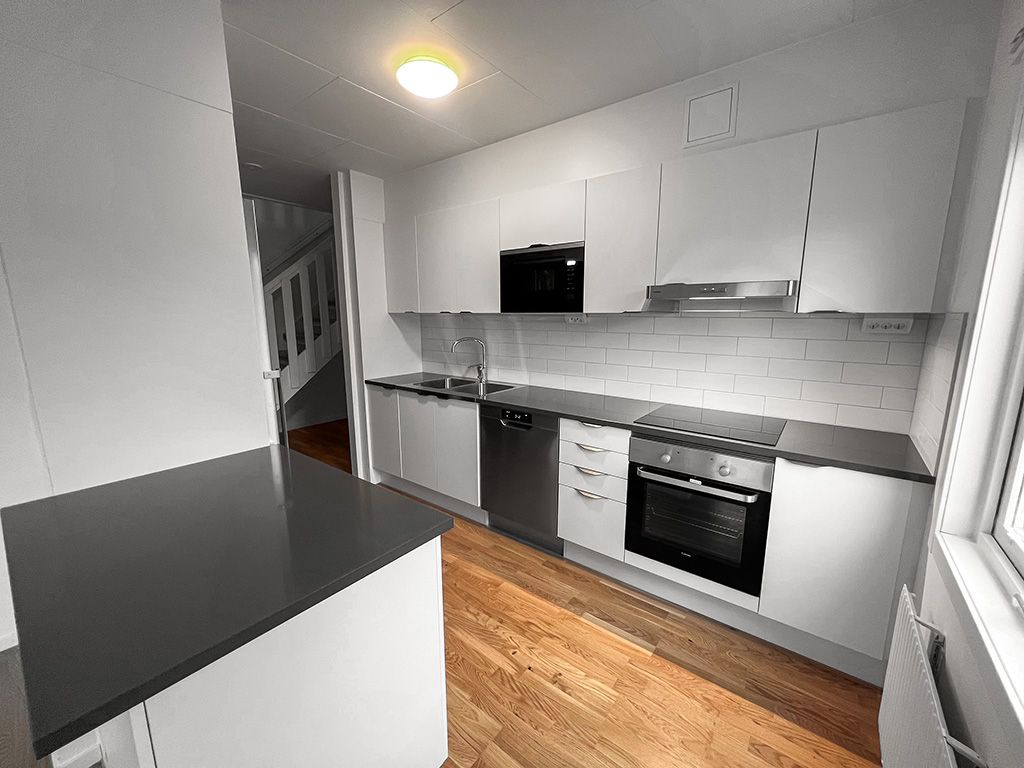 Interiörbilderna är exempelbilder på standarden. ### Visning * * * Är du intresserad av en visning? Anmäl dig här Om lägenheten Charmig etagelägenhet om 110 kvadratmeter som erbjuder en härlig terass. På nedre plan ligger köket som har diskmaskin och inbyggd mikro. På båda våningsplan finns det ett helkaklat badrum varav ena är utrustat med tvättmaskin och torktumlare, båda har dusch. Här finns generösa ytor att trivas på och lägenheten renoverades 2023 och har genomgående ljusa färgval. Området Här bor du är ett trivsamt bostadsområde med några minuter till Bäckby egna centrum med post, apotek, bank, skola, bibliotek, restaurang och mataffärer. På Bäckby finns fina grönområden, elljusspår, förskola, idrottsområden och motionshallar. Dessutom ligger Erikslund shoppingcenter endast några minuter bort med bil