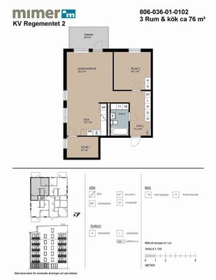 Genomgående ljusa ytskikt och parkettgolv. Hallen bjuder på goda förvaringsmöjligheter med garderob. Kök med kylskåp, frys och spis med ugn. Lägenheterna är förberedda för både diskmaskin och mikro. Badrummet är helkaklat med dusch, toalett och handfat, samt överskåp för bra förvaring. Tvättmaskin och torktumlare, alternativt kombimaskin är standard i samtliga lägenheter. Balkong eller uteplats.