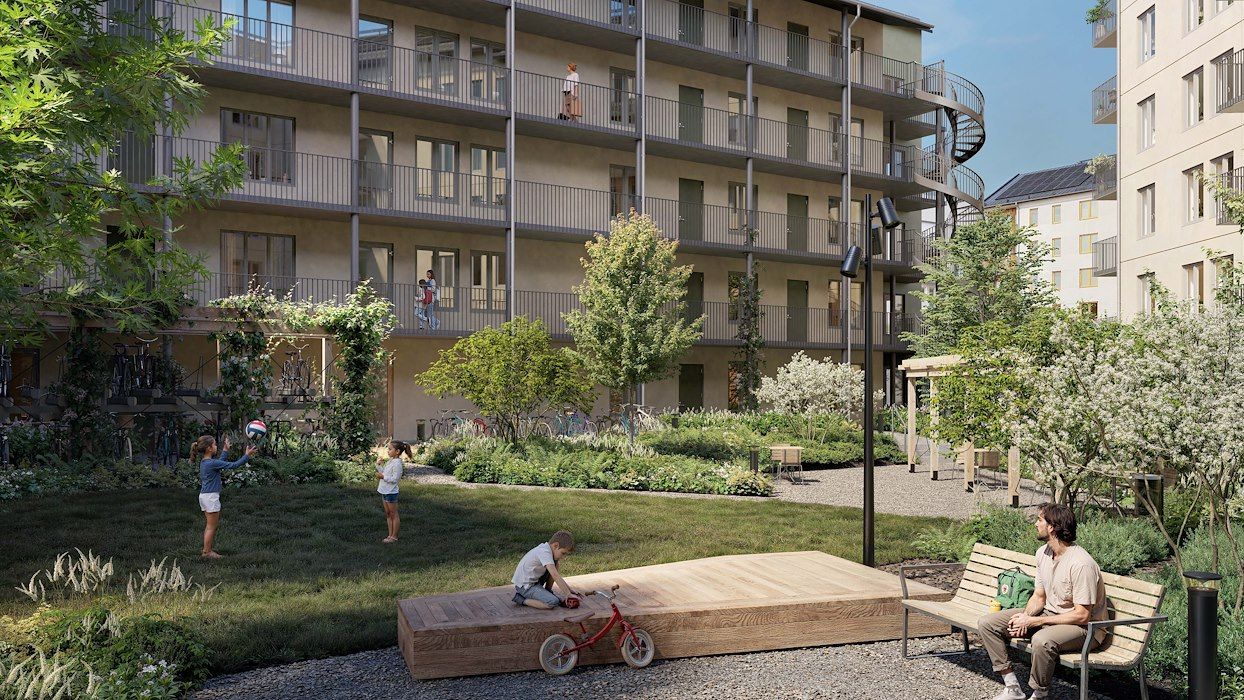 Den lummiga innergården, som delas med bostadsföreningen Juno, är perfekt för lugna stunder och sociala möten. Trapphuset välkomnar dig och dina gäster med gröna och grå toner som har stilfulla ekdetaljer och ger en varm känsla.