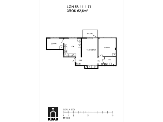 3 rm. apartment of 62 m²