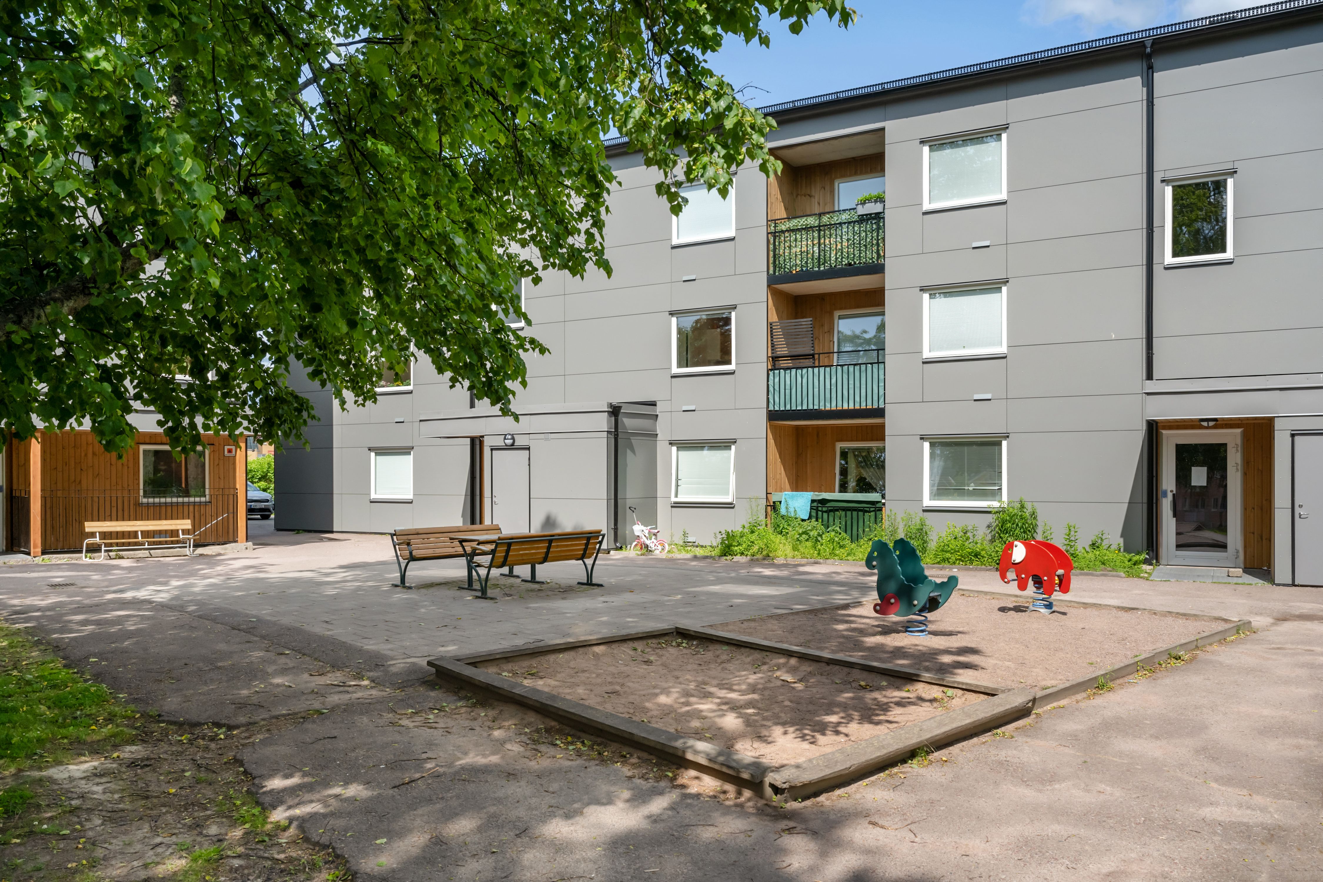 Kv Hästen består av fyra hus som ligger i fyrkant, med lekplats på gården. Kvarteret ligger alldeles intill Stureskolan (åk 1-6), buss- och järnvägsstation samt den vackra Sveaparken med bl a stor leplats. Stamrenovering är gjord 2016-2017