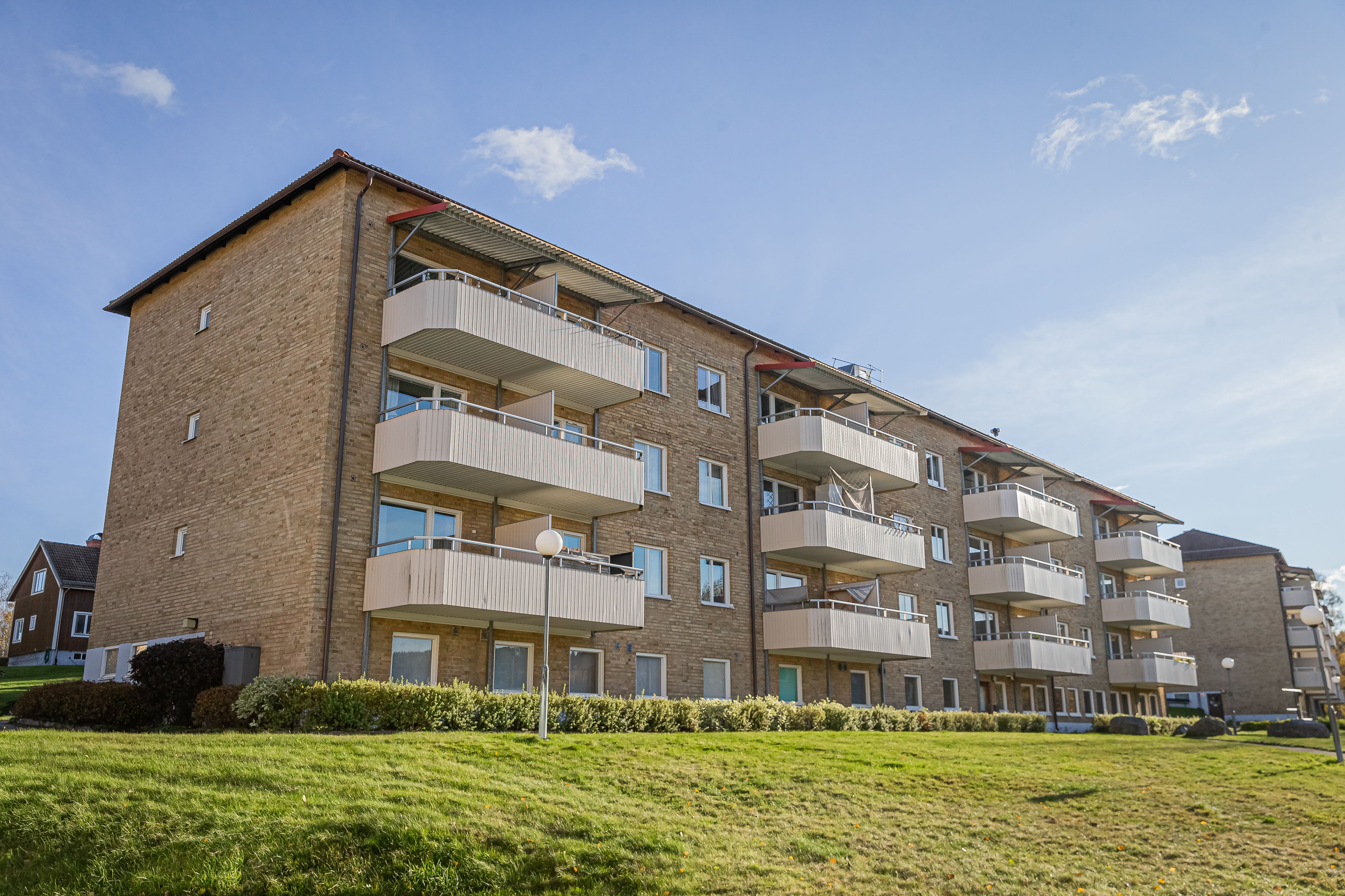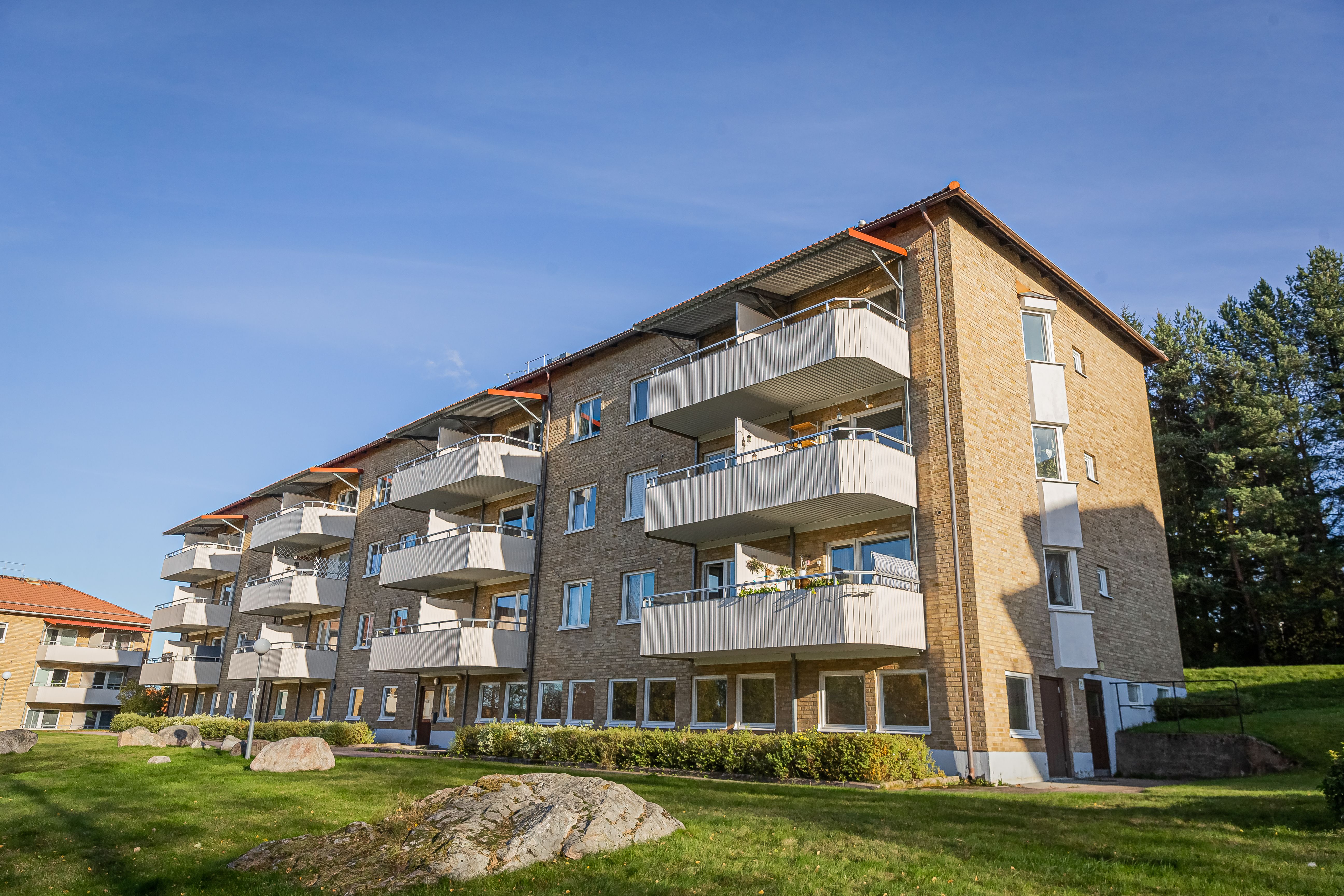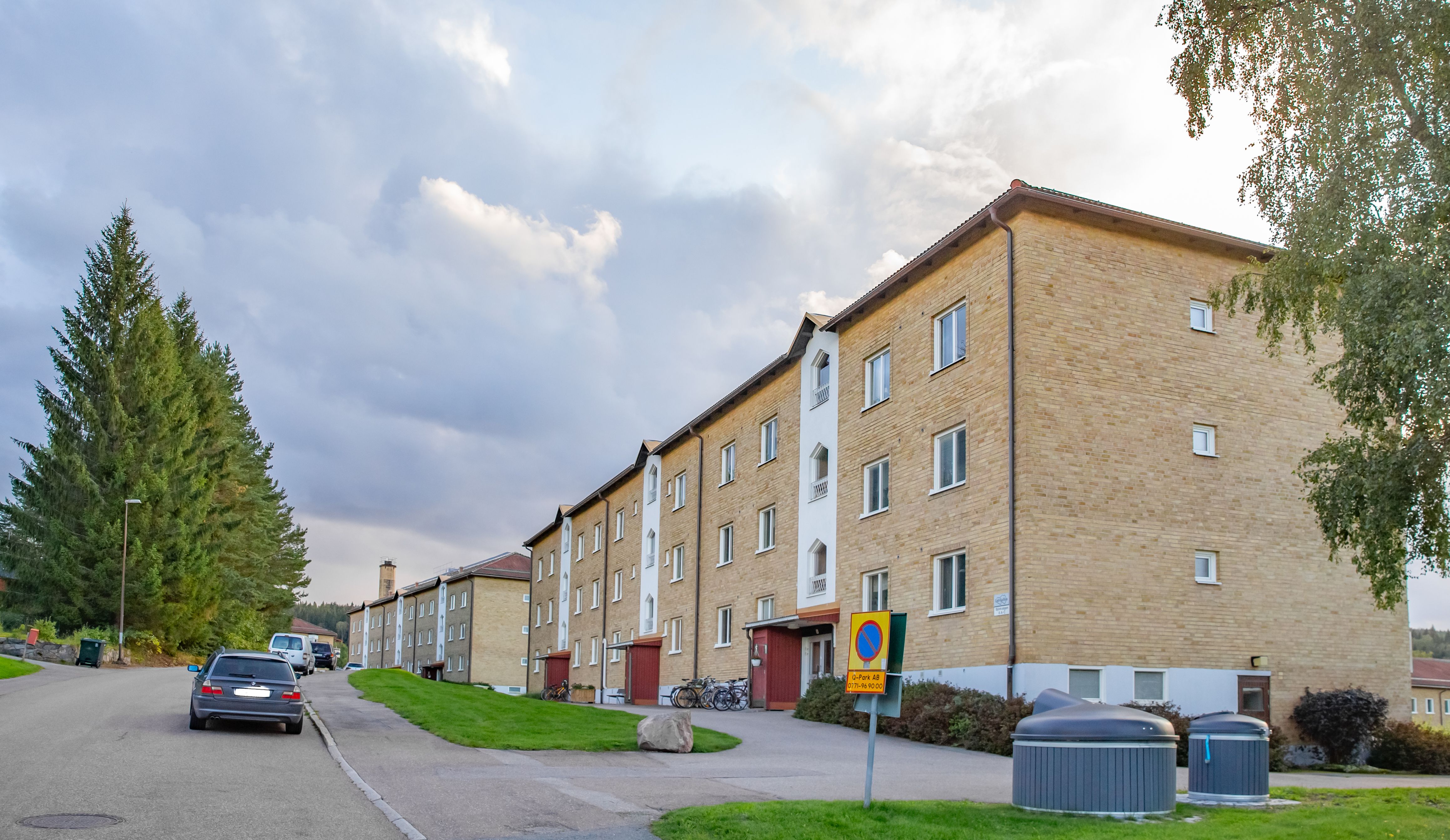 Älgkon 18 är våra äldsta hus på Högberget - de byggdes 1918, men har under åren renoveras både ut- och invändigt. En gemensam innergård med gräsytor finns för de boende.