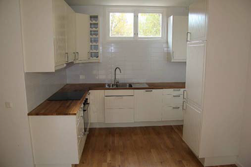 - Köket, inbyggnadsspis, ugn, fläkt, kyl/frys och diskmaskin.