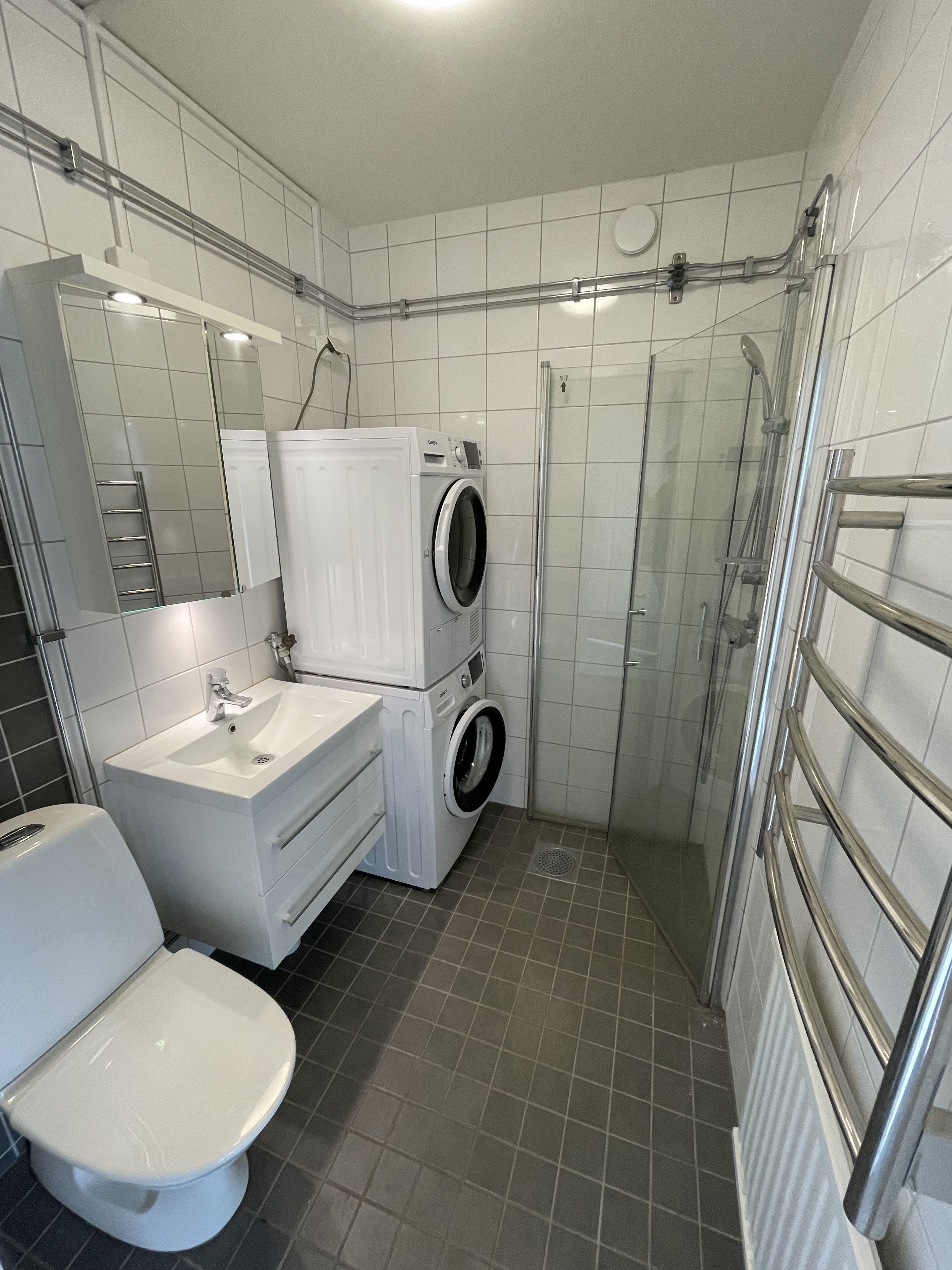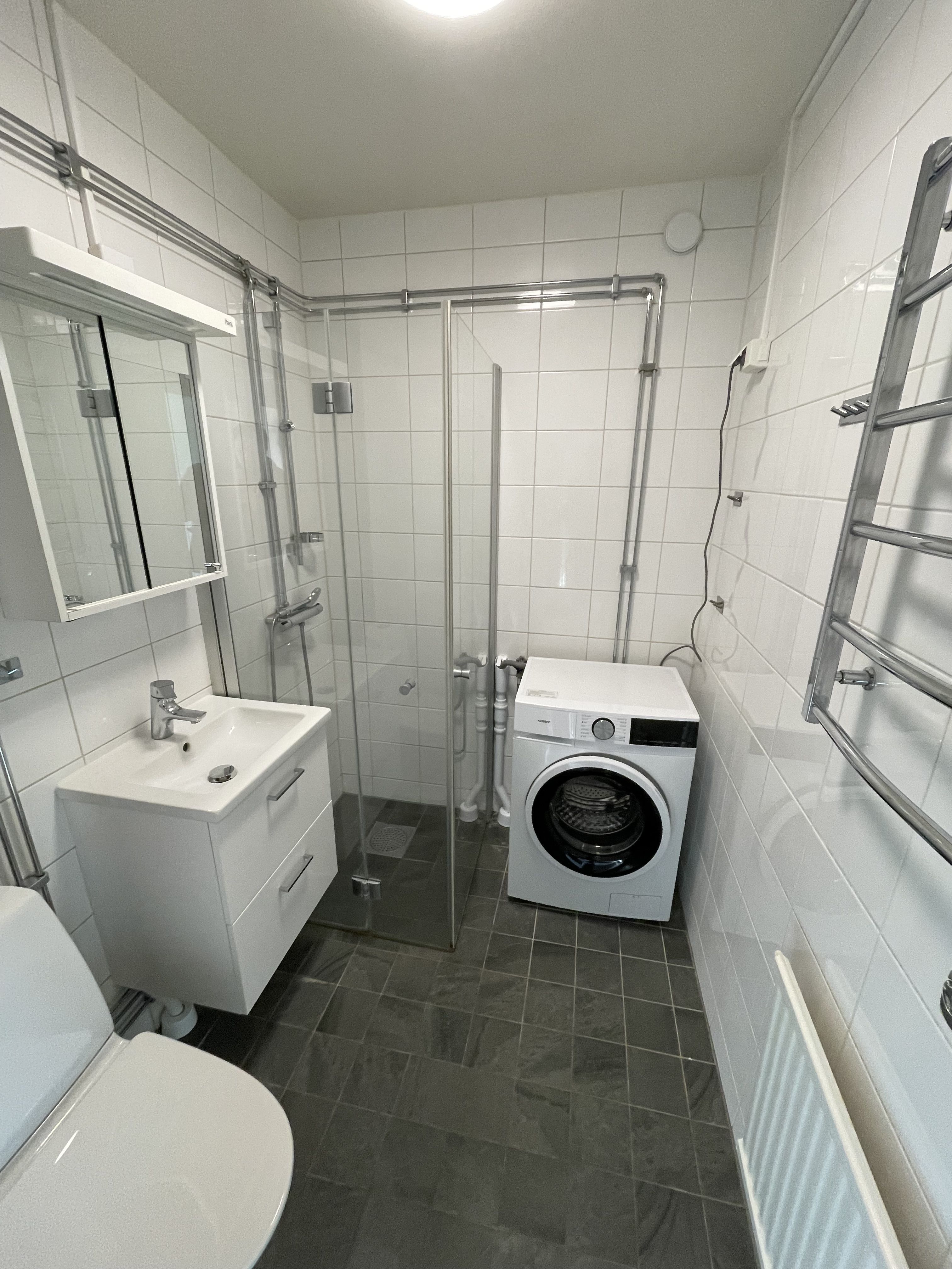 Badrummet har helrenoverats med klinkergolv och kaklade väggar, och är utrustat med duschdörrar i glas, handdukstork samt kombinerad tvätt- och torkmaskin.