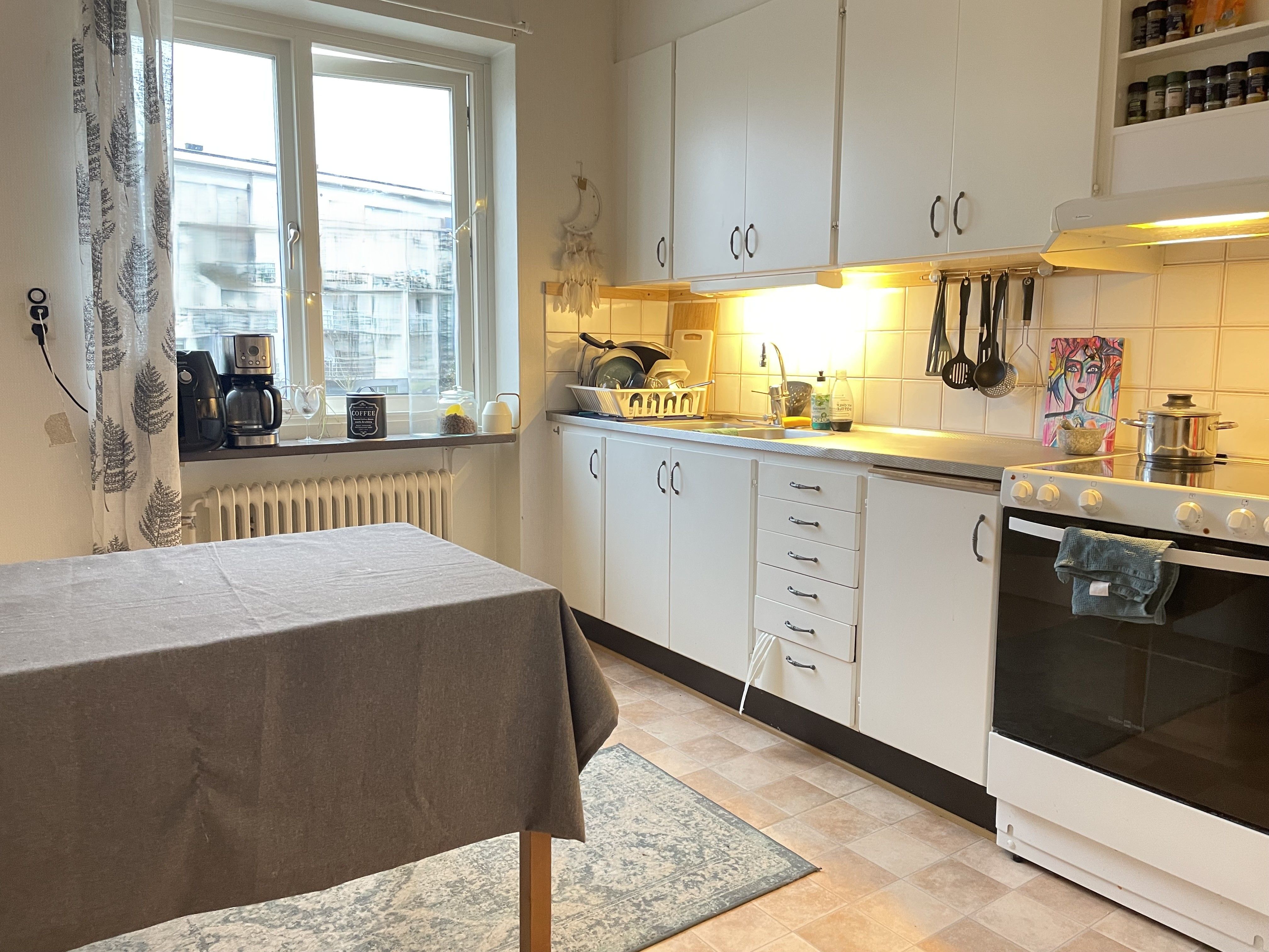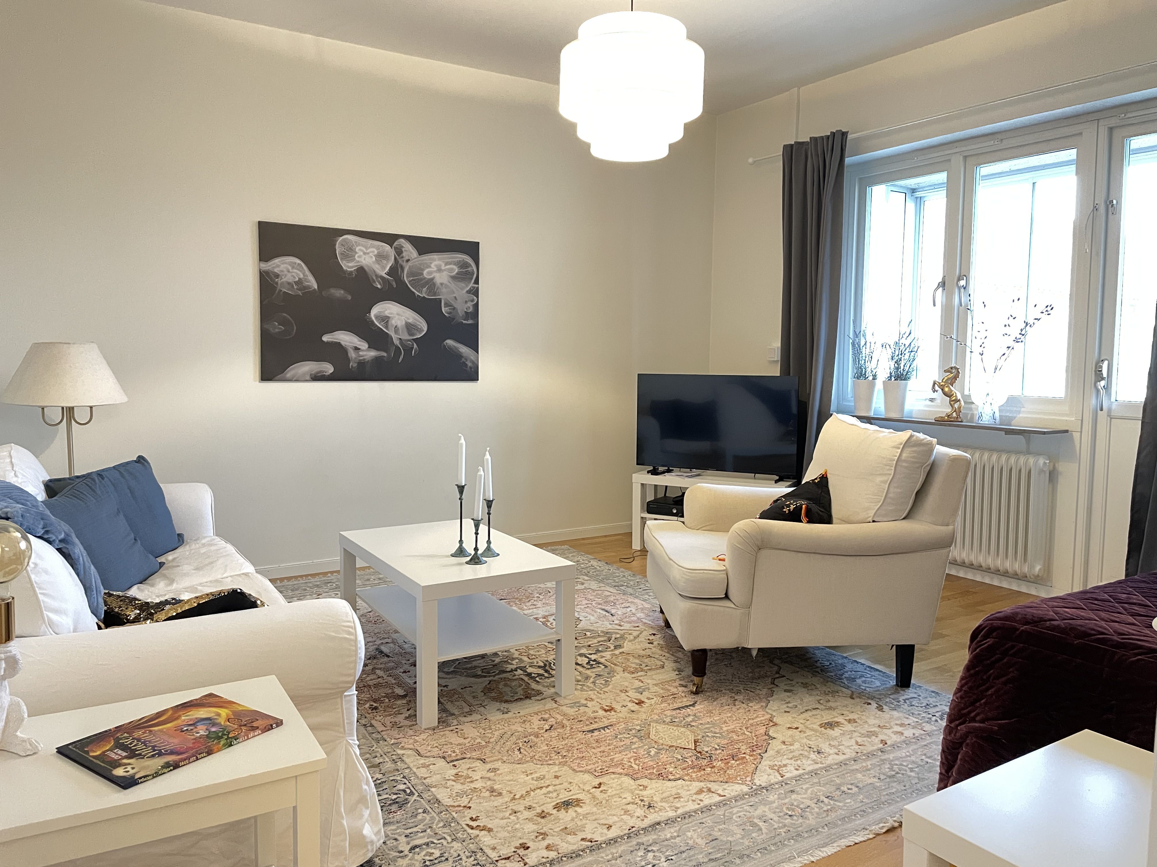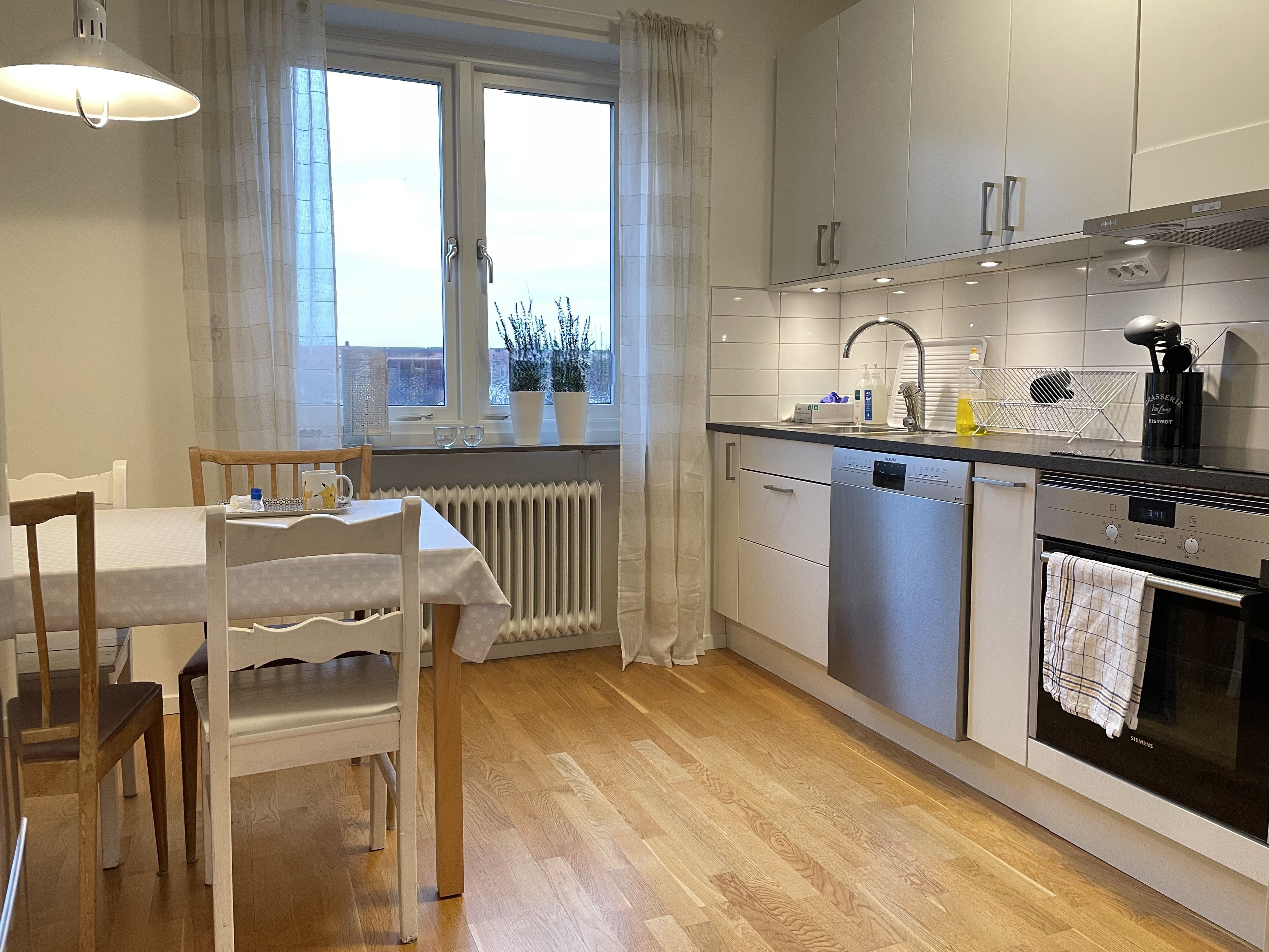 Elegant ekparkett i hela bostaden förutom en praktisk del med grått klinker i hallen. Väggar, tak och snickerier är målade i fräscht vitt för en ljus och tidlös känsla. är smakfullt inrett med vita köksluckor och vitt kakel ovanför diskbänken. Här finns rostfria, energisnåla vitvaror, spishäll och inbyggnadsugn – alla för att ge en modern och funktionell matlagningsmiljö. är helkaklat i vitt med grå klinker på golvet. Du behöver själv teckna det hos GlobalConnect, där du även tecknar bredbandsabonnemang som ej ingår i hyran. Hyresgästen tecknar eget abonnemang för hushållsel. Hyran som framgår i annonsen är enligt 2025 års hyresnivå