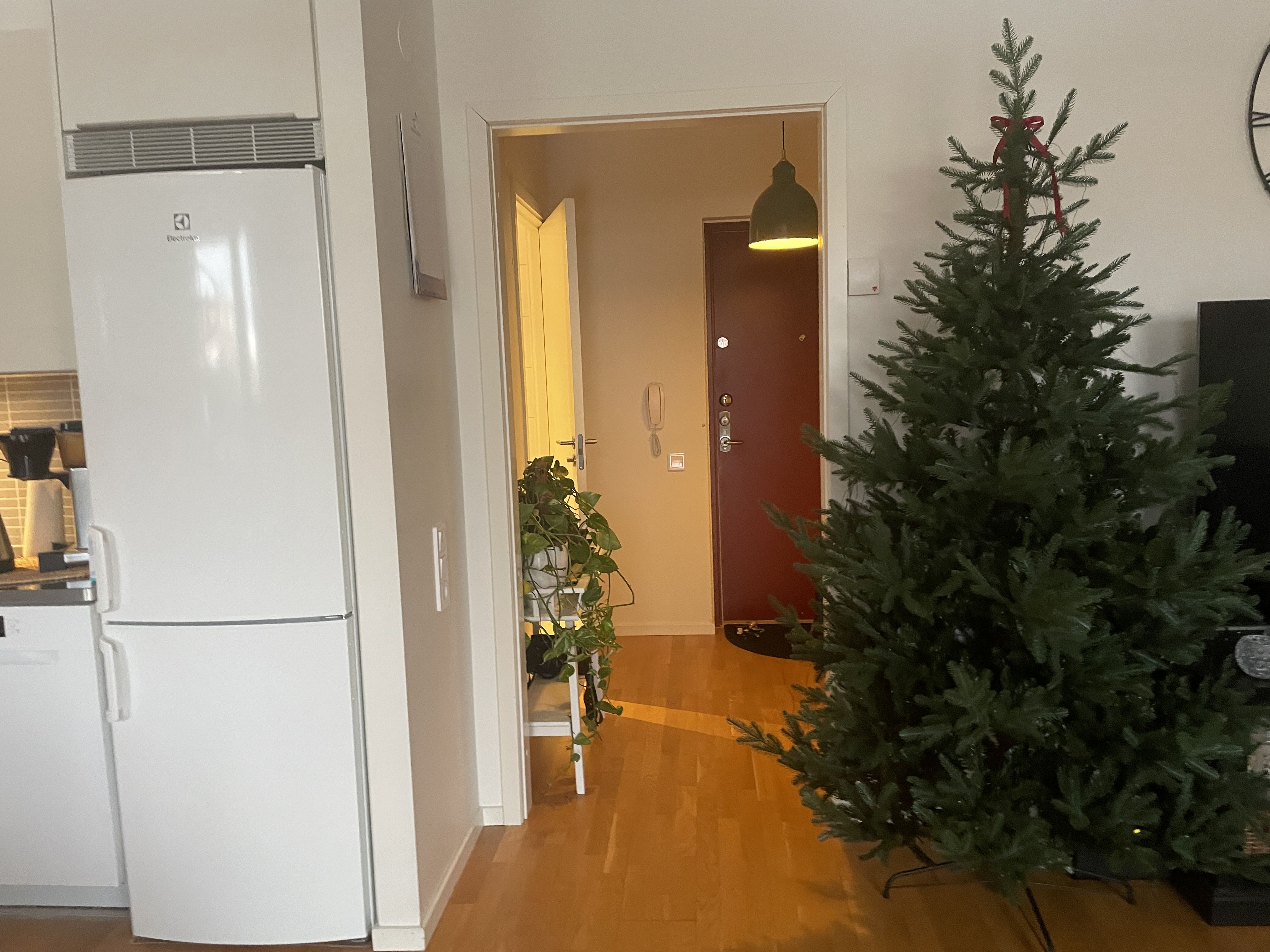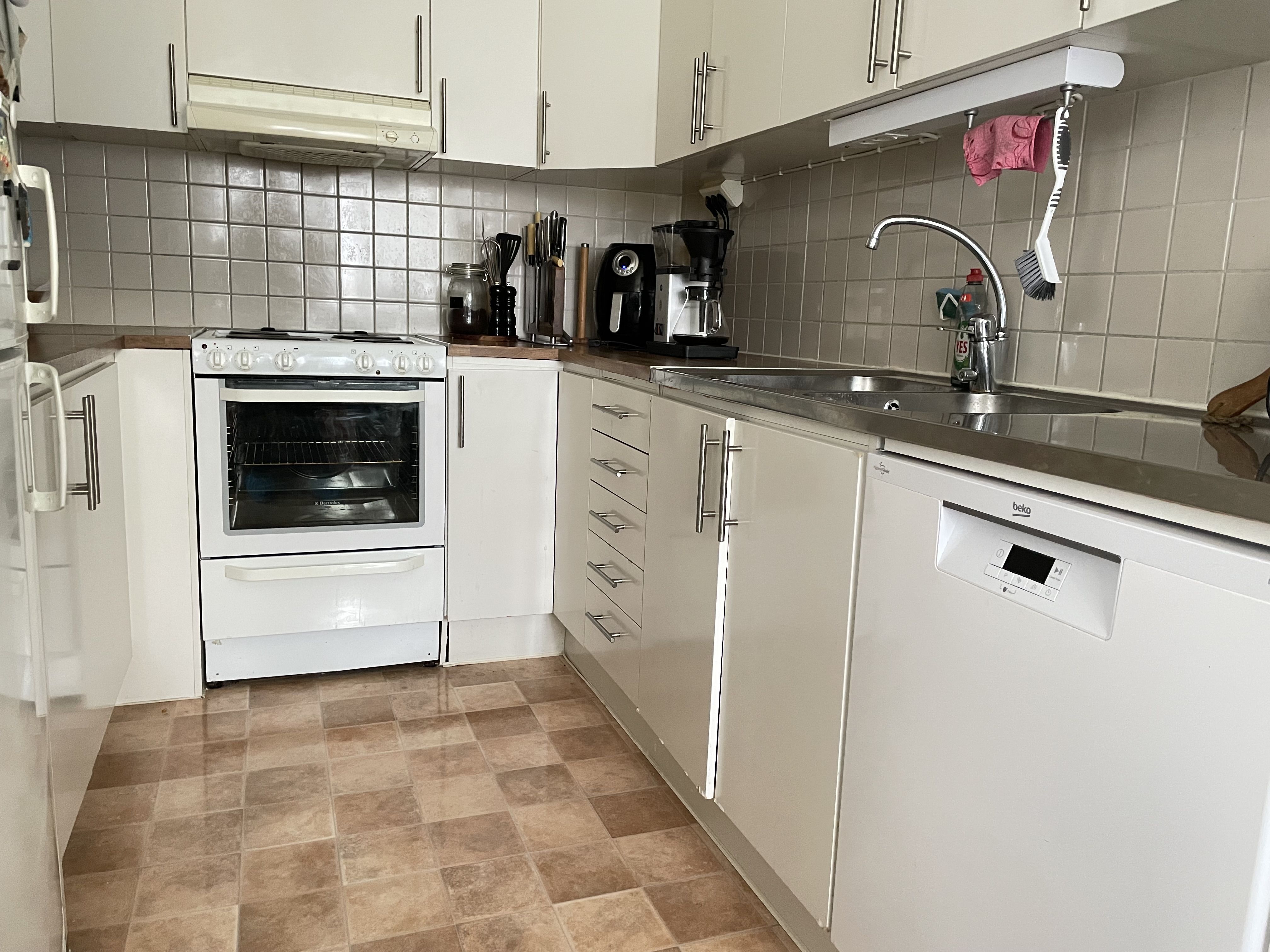Köksinredningen går i vitt, spishäll, inbyggnadsugn, nya bänkskivor och vitt kakel ovanför diskbänken. Rostfria energisnåla vitvaror. Lägenheten har ett vackert ekparkettgolv genomgående i hela lägenheten förutom en liten ruta med grått klinkergolv i hall. Väggar, tak och snickerier är vitmålat. Badrummet har helkaklade väggar i vitt och grå klinker på golvet. Duschen med glasdörrar som kan vikas inåt när duschen inte används, vilket ger bättre golvyta.
