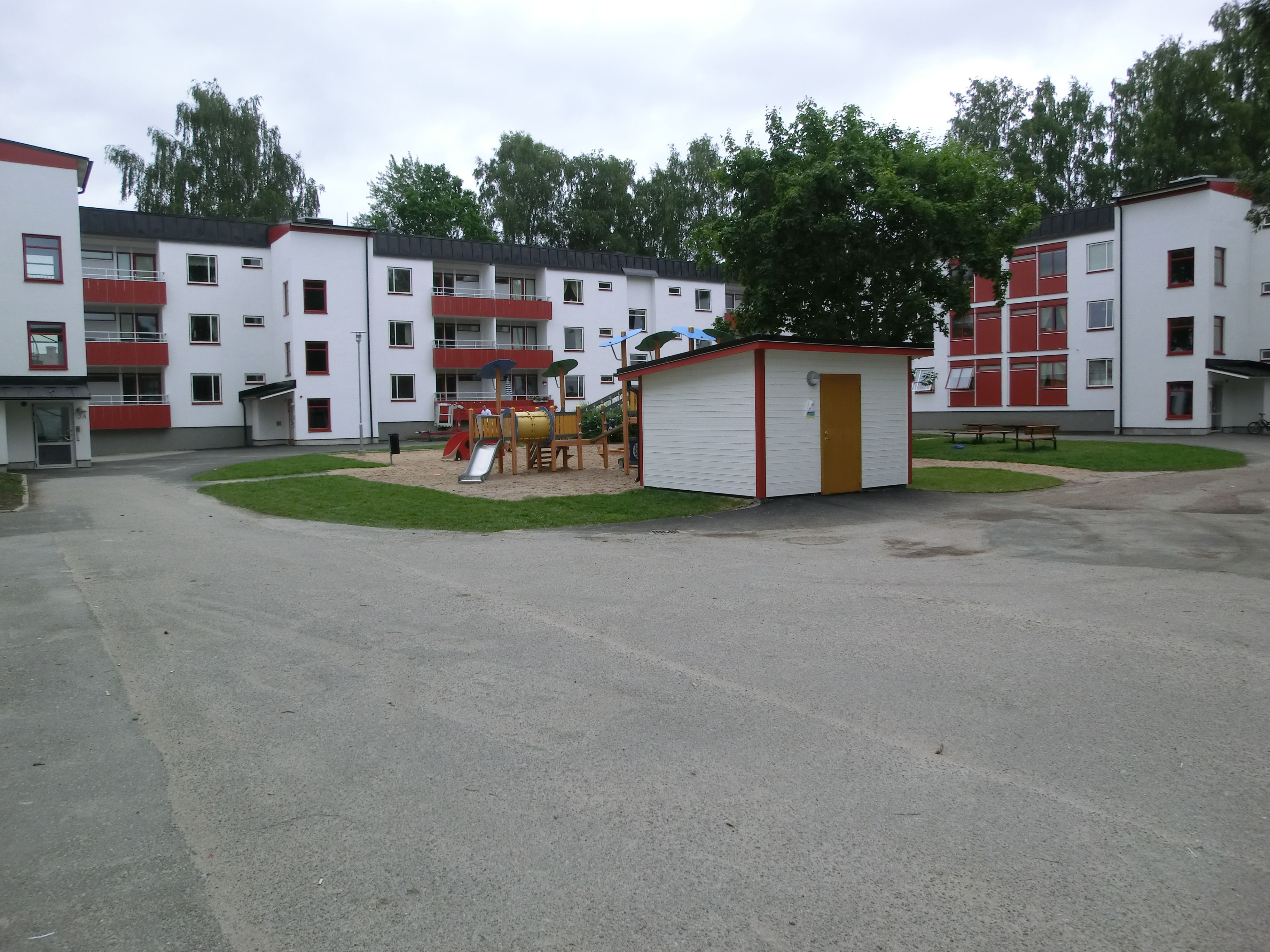 Miljörum för sopsortering finns på innergården.