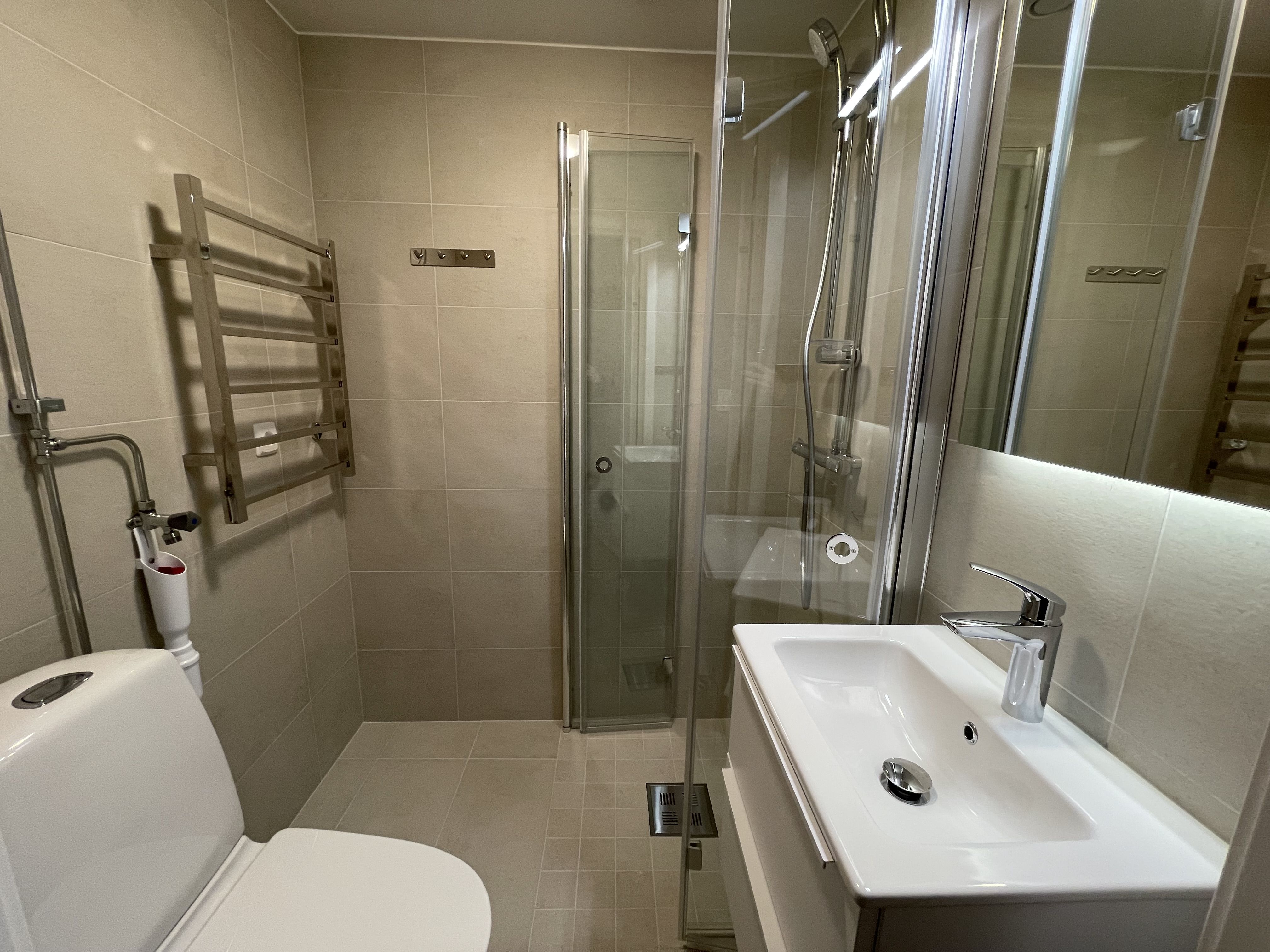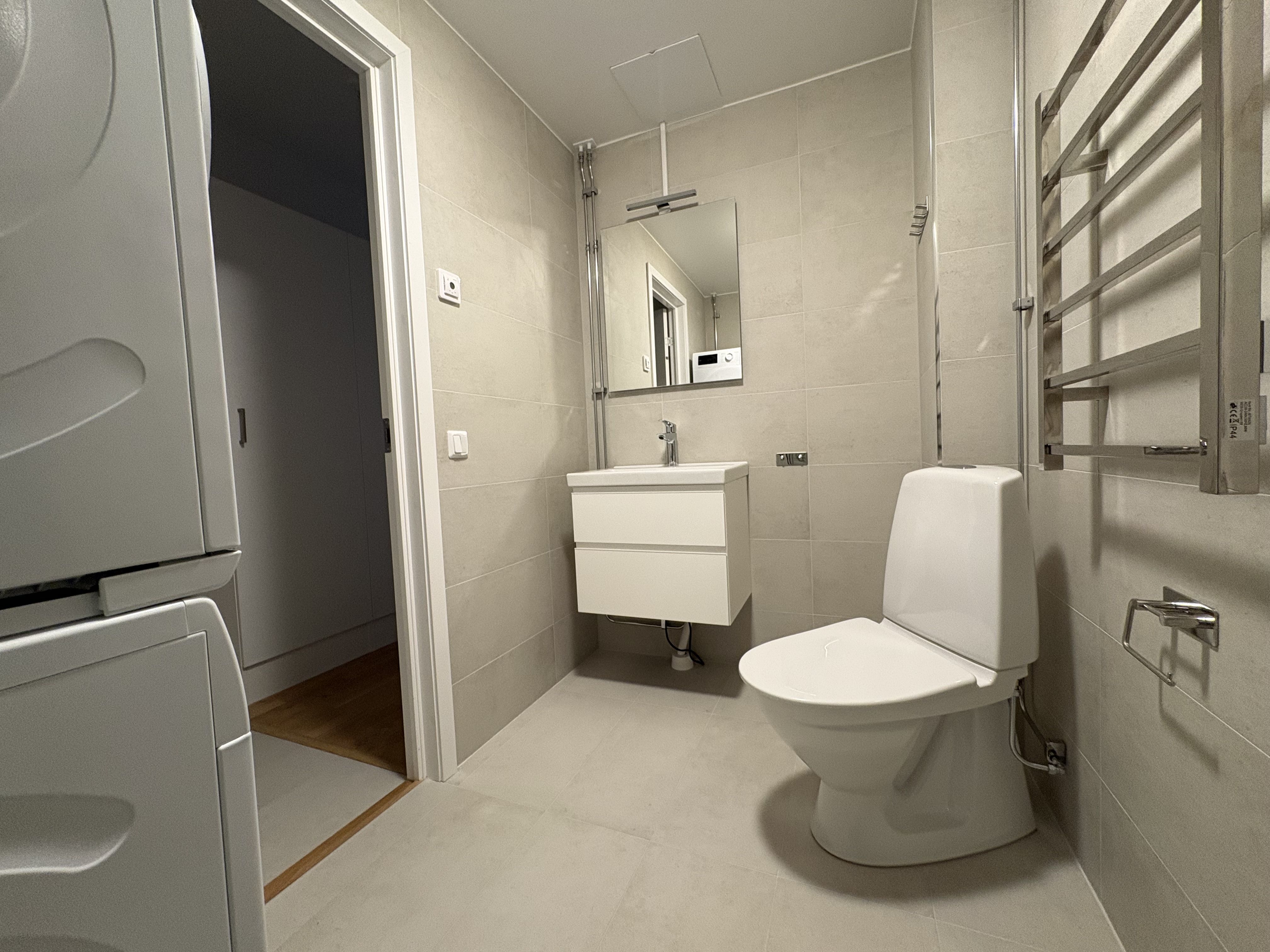 Det nyrenoverade badrummet är utrustat med dusch, tvättmaskin, ljust kakel och grå våtrumsmatta.