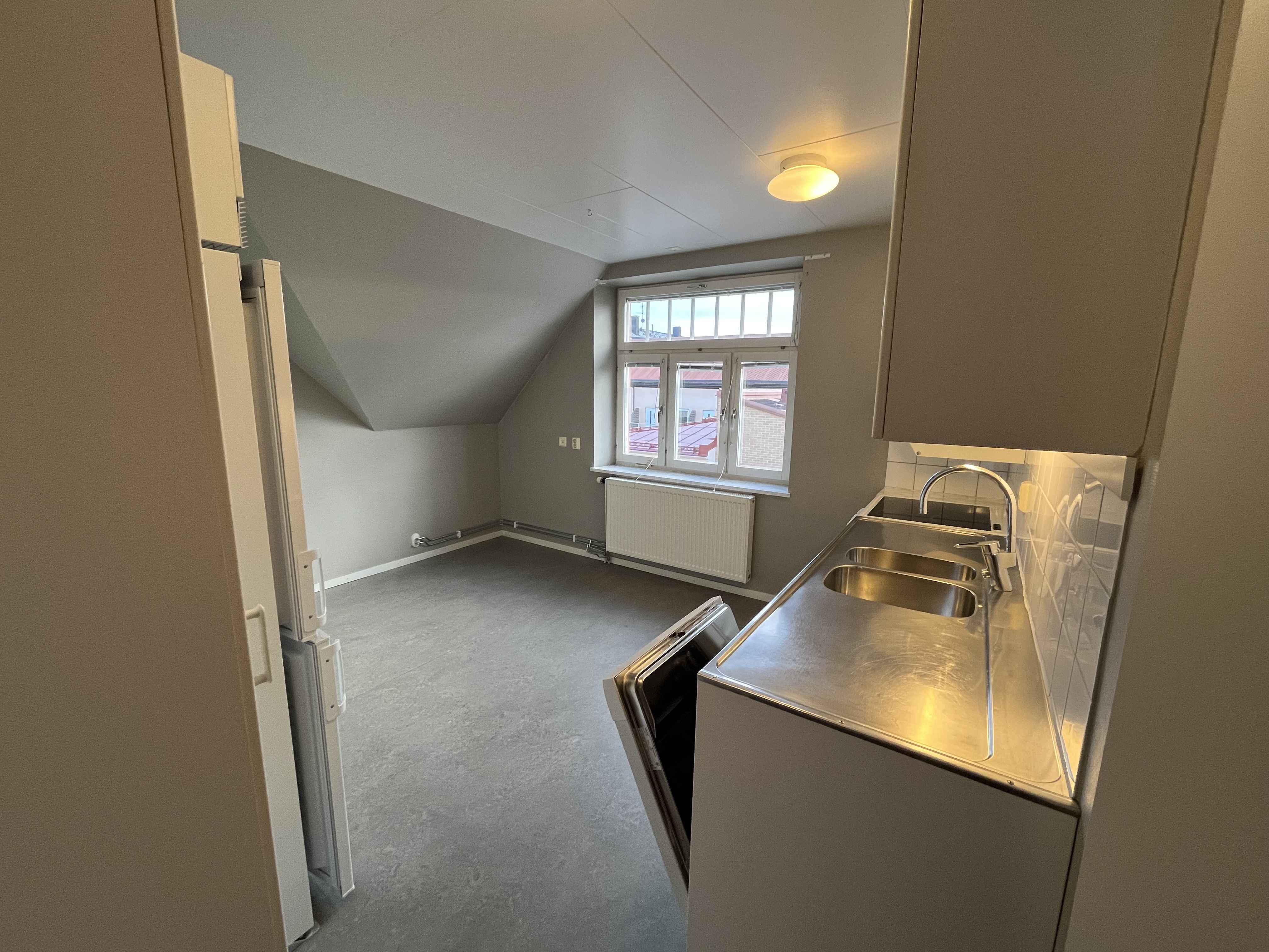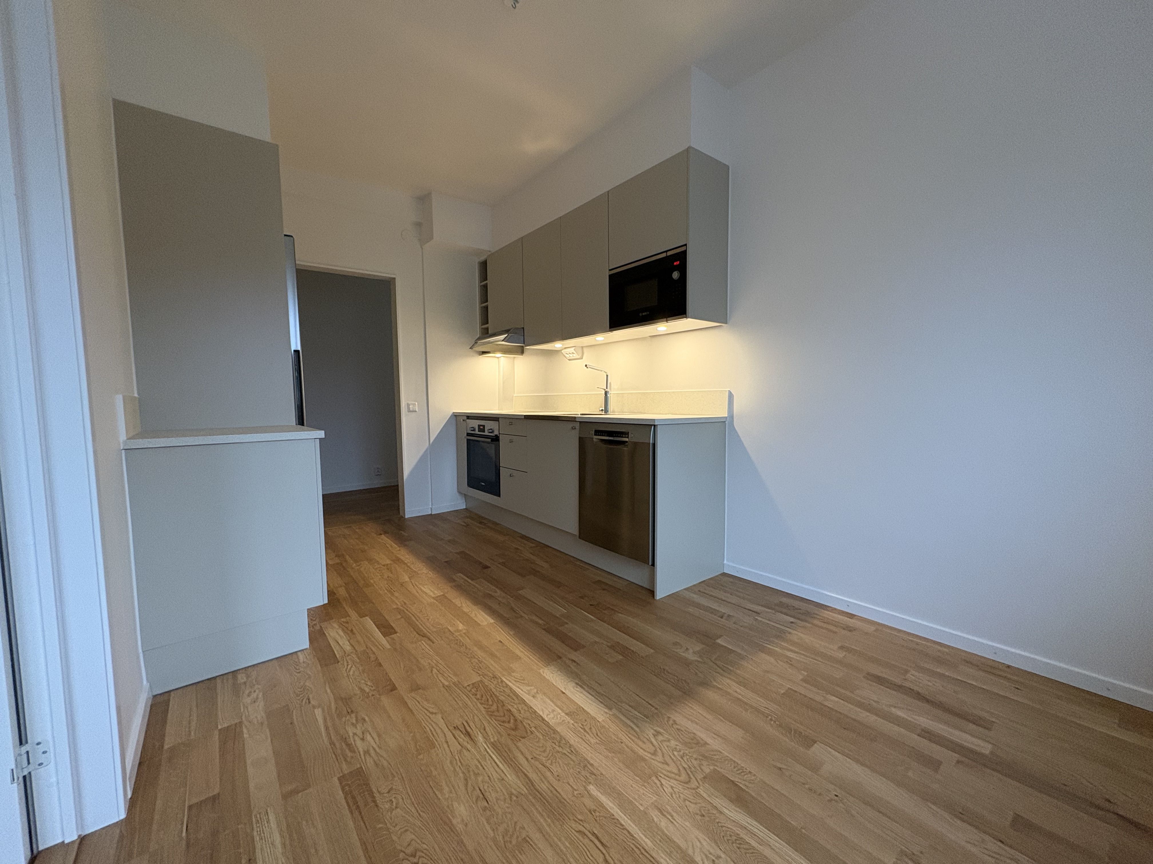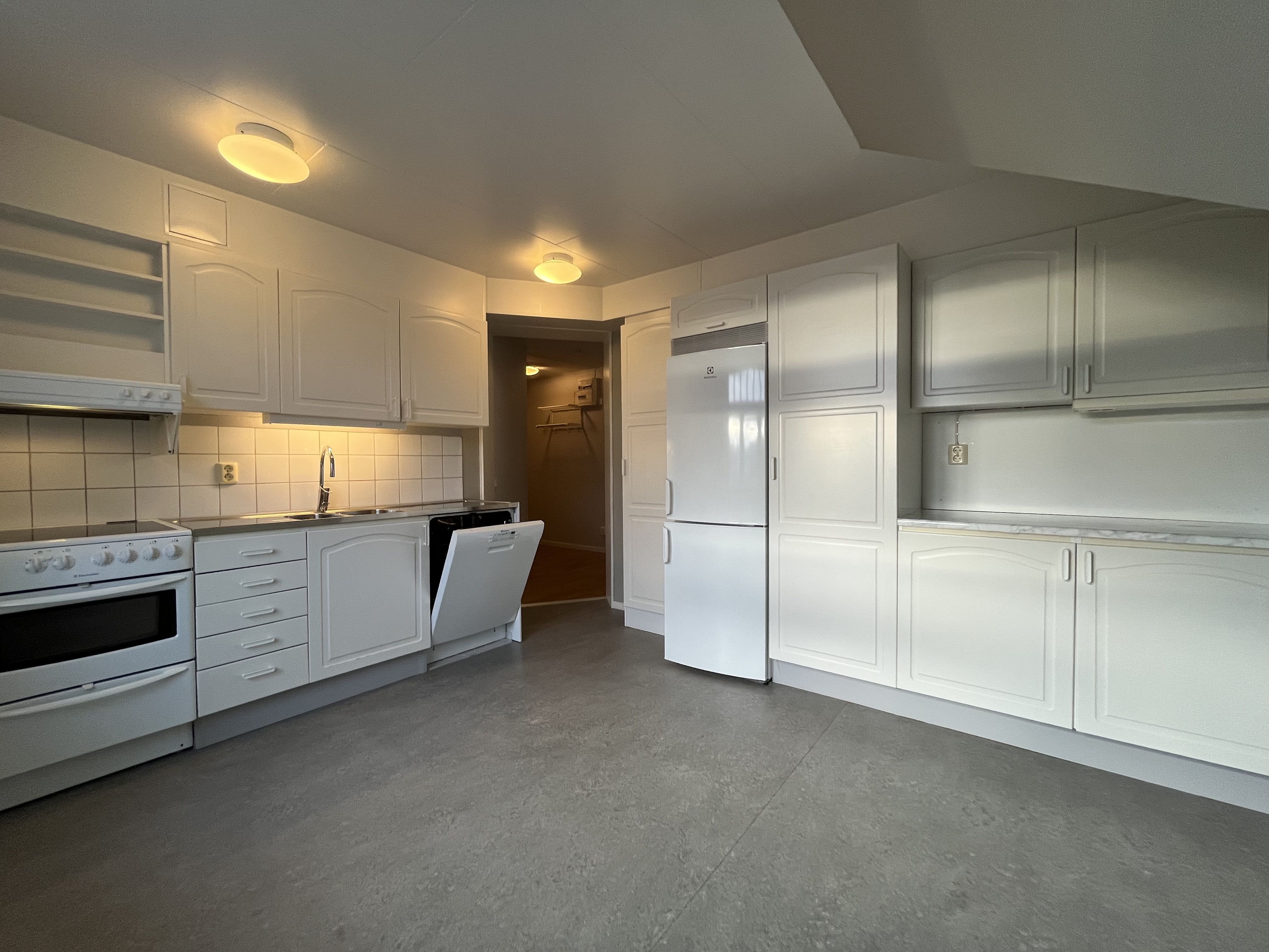 Här möts du av ljusa väggar och en rymlig hall med mörkare plastmatta som leder vidare in i köket.