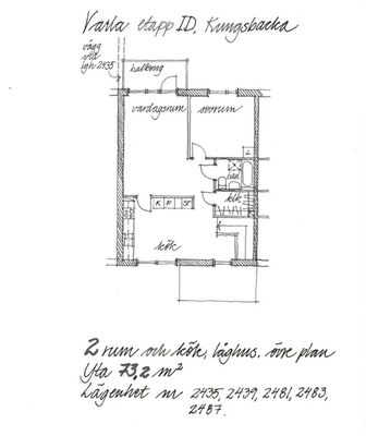 Lägenhet om två rum och kök med balkong. I vardagsrummet ligger ekparkett och i övriga rum finns linoleummatta. Badrummet är utrustat med dusch och väggarna är kaklade upp till överkanten av dörrpartiet. Porttelefon finns. Möjlighet till bredband från flera leverantörer.