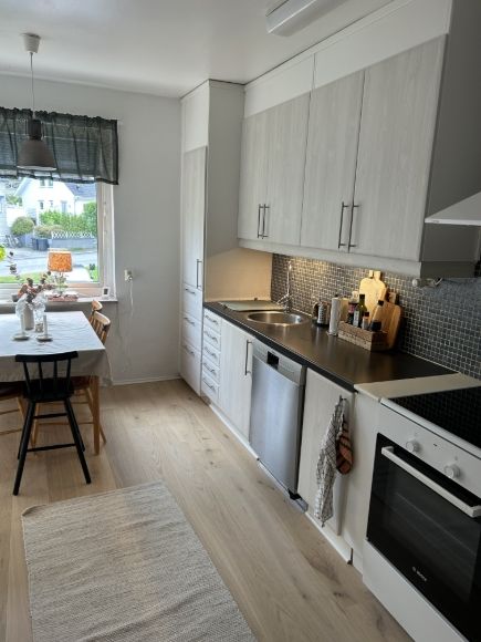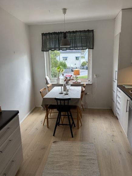 Fin lägenhet med egen uteplats i naturnära område. Hall med ingång till helkaklad toalett med dusch och TM/TT. V-rum och kök i öppen planlösning. Välutrustat kök med gasspis, diskmaskin, multiugn och grill.