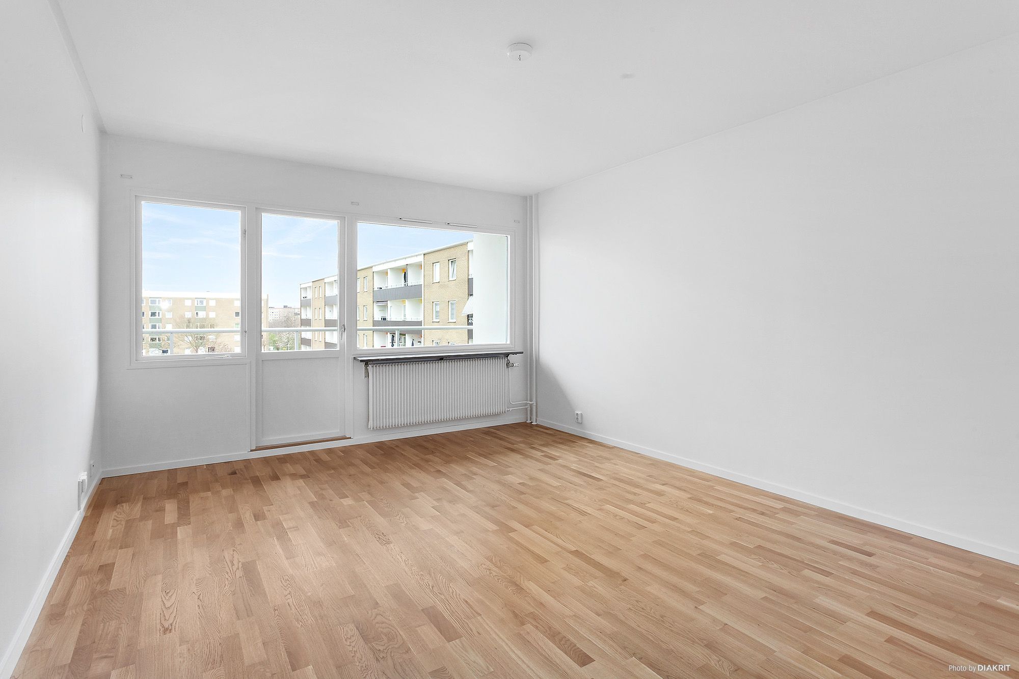 Väggar & tak vitmålade. Golv ekparkett i sovrum, vardagsrum & kök. Även hallen har ekparkett utom precis vid entrén där det är klinker (grått).