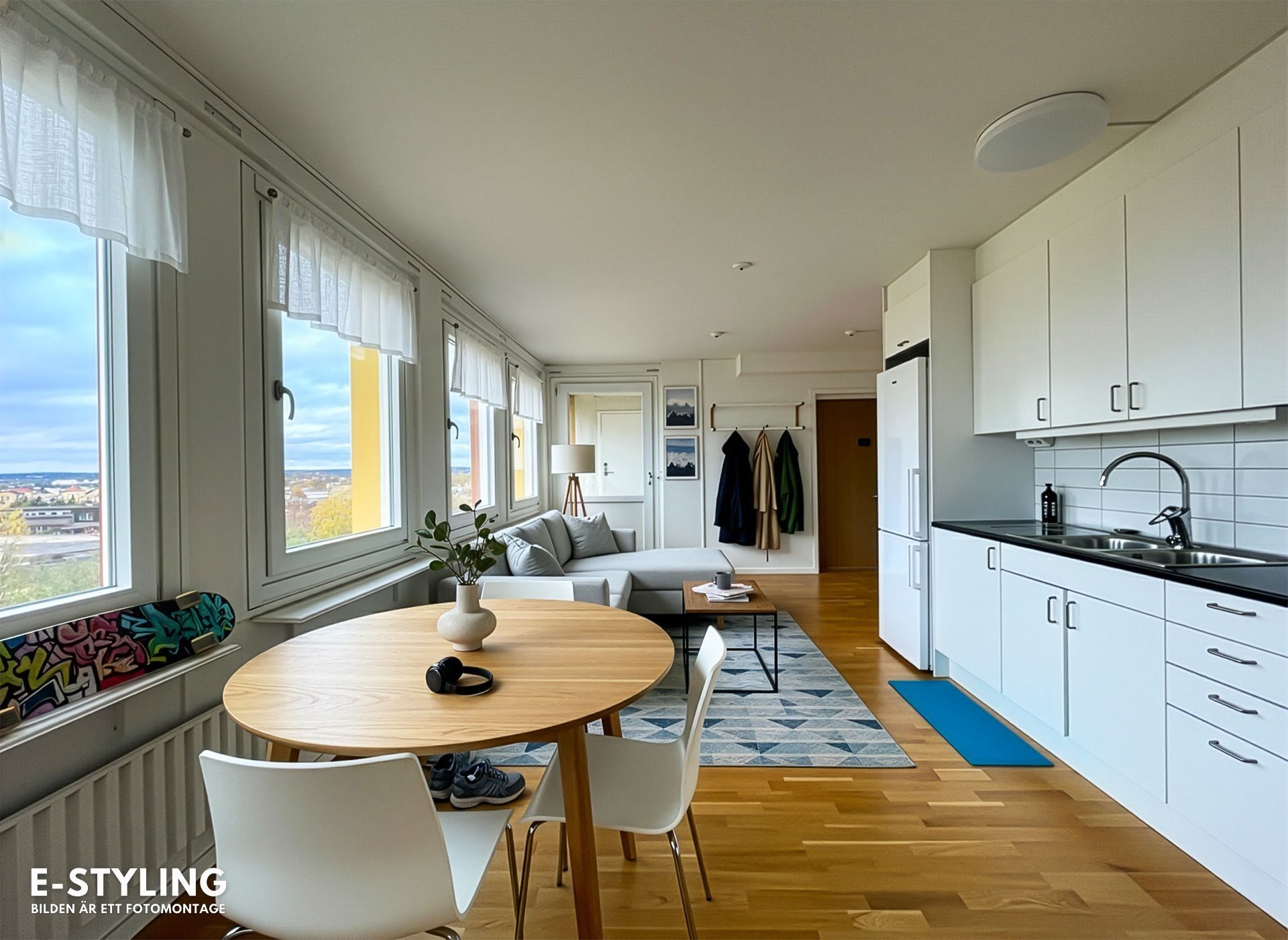 Vardagsrum/Allrum med ett fint ljusinsläpp och öppen planlösning mot kök. Köket har vita köksluckor och grå bänkskiva och är utrustat med kyl/frys, ugn och glaskeramikhäll. Här finns gott om förvaring och det är förberett för diskmaskin.