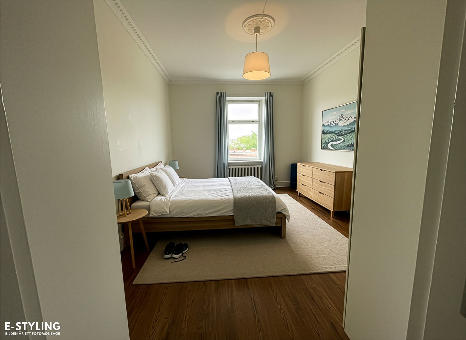 Sovrum med plats för dubbelsäng och annat möblemang. Här finns även garderober