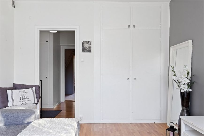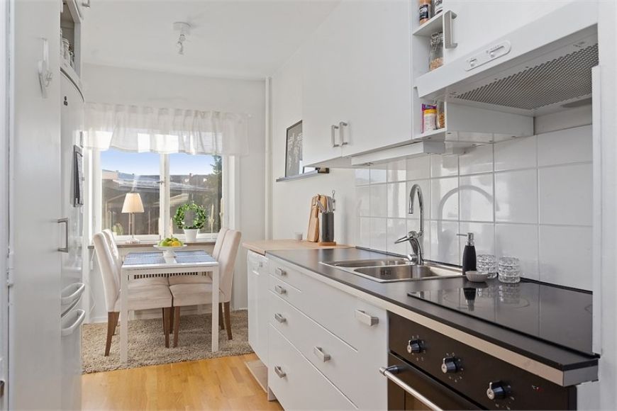 Bostaden har genomgående vitmålade väggar och ekparkett.