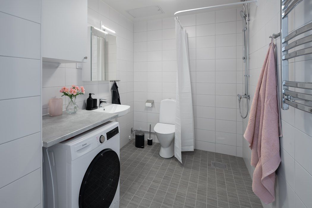 Köken har vita vitvaror och i varje badrum finns tvättmaskin och torktumlare, alternativt en kombimaskin.