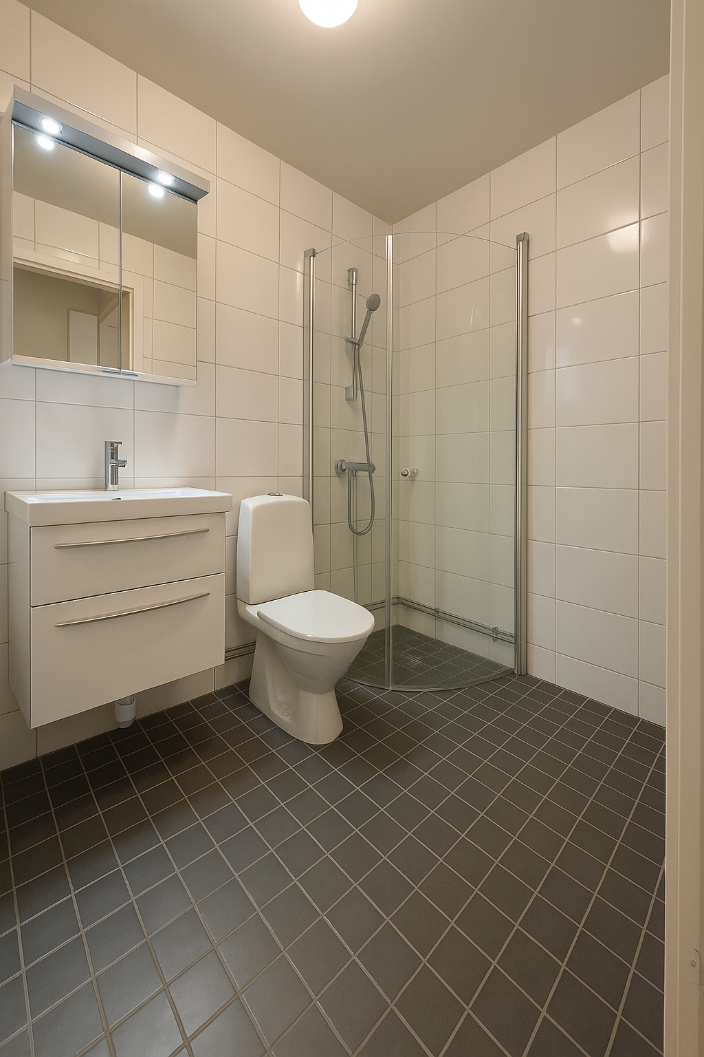 Badrummet renoverades 2023 och är helkaklat med vitt kakel på väggarna och grå klinker på golvet. Här finns dusch, handdukstork samt tvättmaskin och torktumlare.