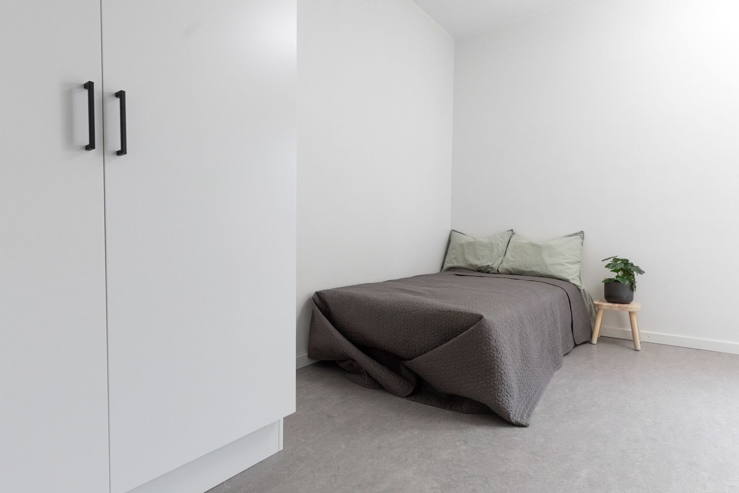 Rymligt vardagsrum/allrum, här finns plats för både större soffgrupp, tv-möbel och säng. Härifrån nås balkongen.