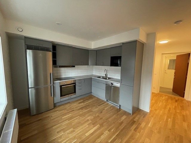 JUST NU - 1 500 kr rabatt/mån t.o.m. maj 2027 Lägenheten annonseras med rabatterad hyra. OBS! * Bilderna i annonsen är från en liknande lägenhet i ett annat projekt, därav kan viss skillnad förekomma. * Inflyttningsdatumet är preliminärt 1 september 2026. ### Om lägenheten Köket är ett vitt kvalitetskök från Vedum, utrustat med diskmaskin, inbyggd mikro och en elegant grå stenbänkskiva som även fungerar som stänkskydd. Den öppna planlösningen ger gott om plats för både matgrupp och soffhörna. Det helkaklade badrummet erbjuder hög standard och är utrustat med egen tvättmaskin och torktumlare – en bekvämlighet som förenklar vardagen. Här bor du med närhet till både stadens puls och grönområden, med goda kommunikationer och service inom bekvämt avstånd. Det här är ett perfekt boende för dig som söker en modern och lättskött hyresrätt med hög standard i ett attraktivt läge. ##### Läs mer om Vapenrocken här